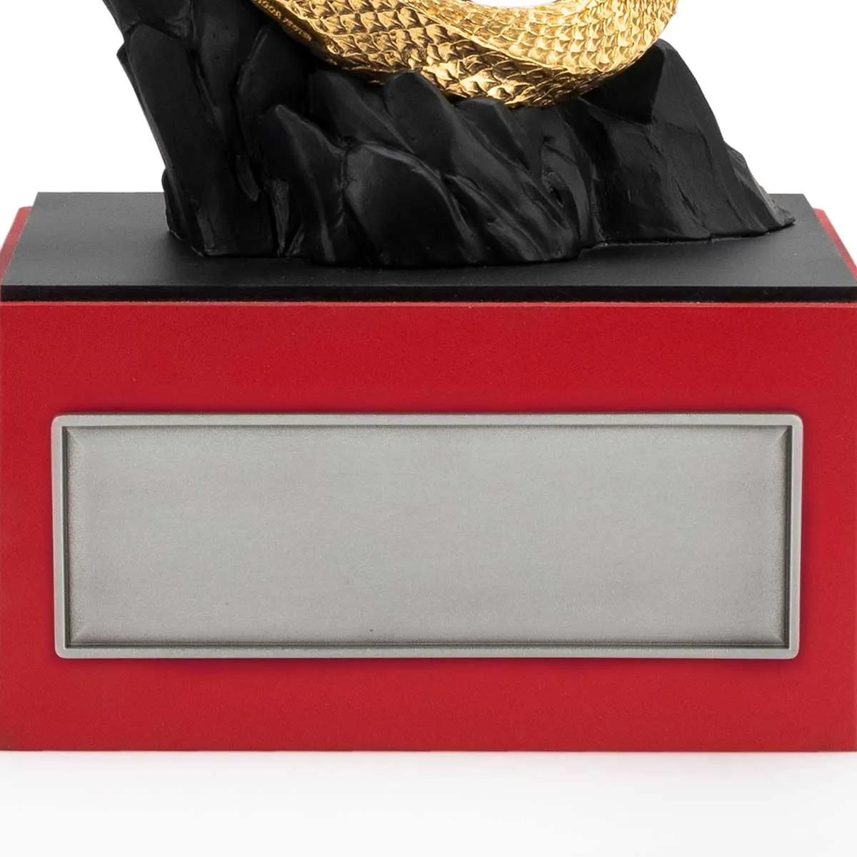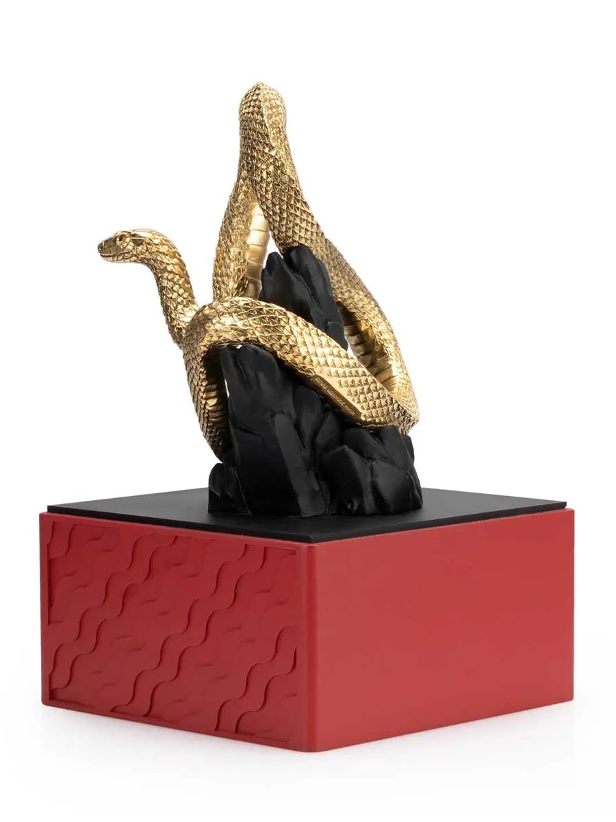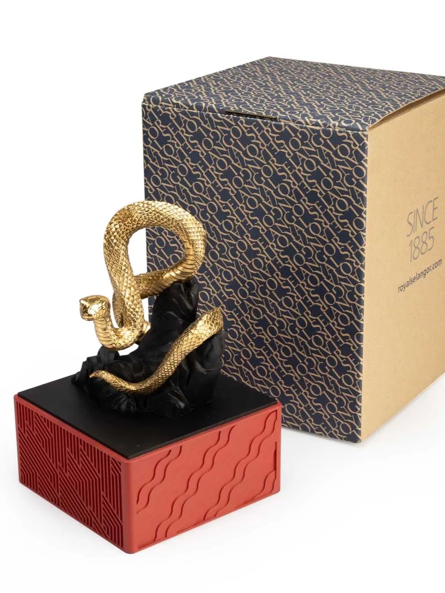 Tượng rắn Thịnh vượng với con rắn cuộn mình trên địa hình đá gồ ghề, dựa vào cơ thể có thể vững vàng ngắm nhìn tới đường chân trời xa xăm một cách lạc quan. Tượng bằng pewter mạ vàng 24K ba chiều nằm trên đế composite màu đỏ thẫm được trang trí bằng các họa tiết cách điệu của sóng, đá và mây. - Kích thước: H24cm x 15cm x 15.5cm (bao gồm đế) - Chất liệu: Tượng rắn bằng pewter mạ vàng, đế composite