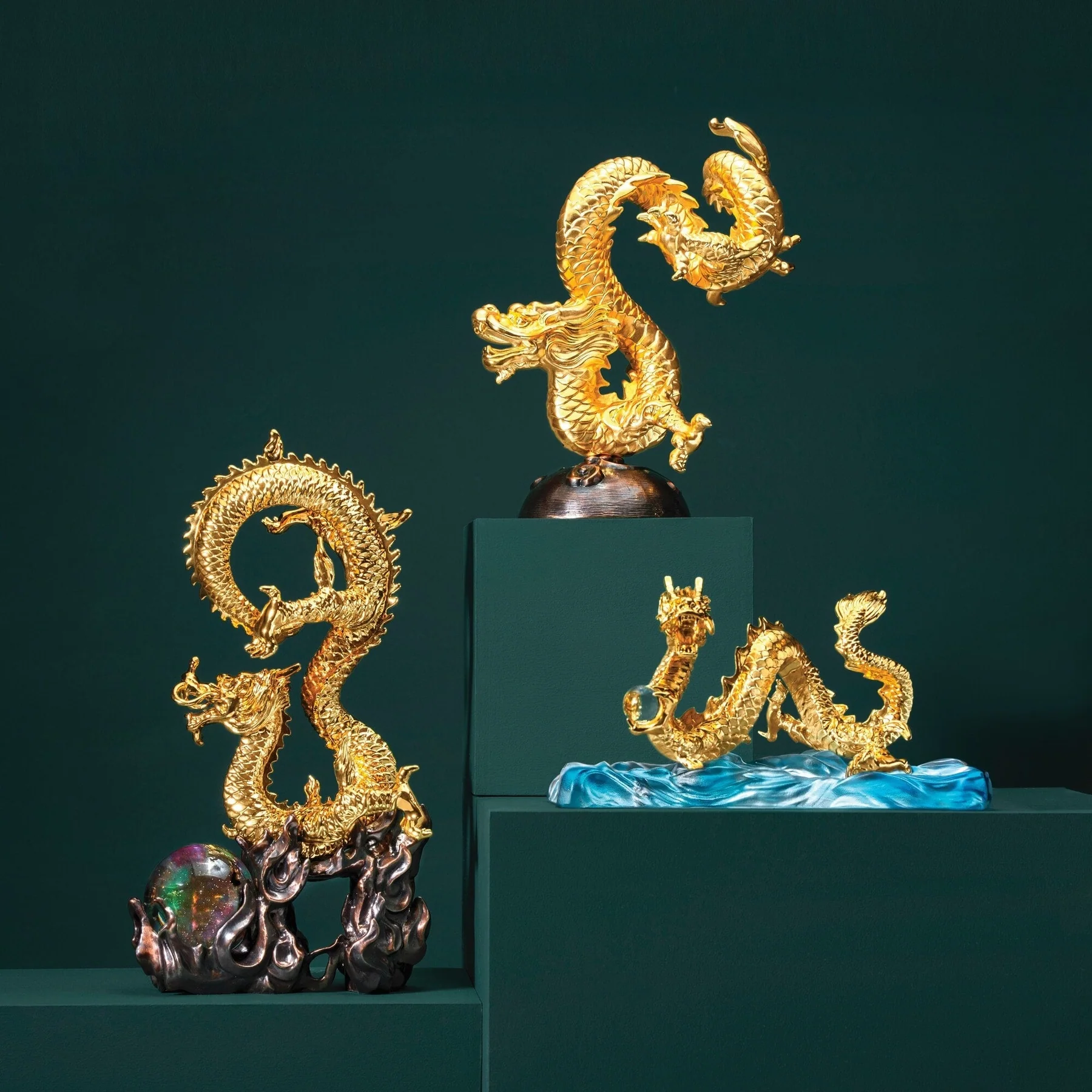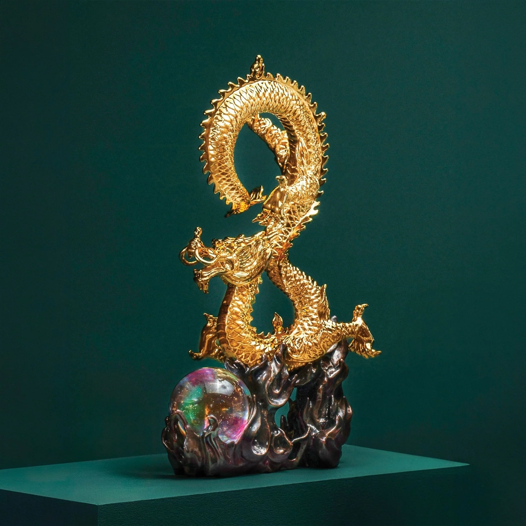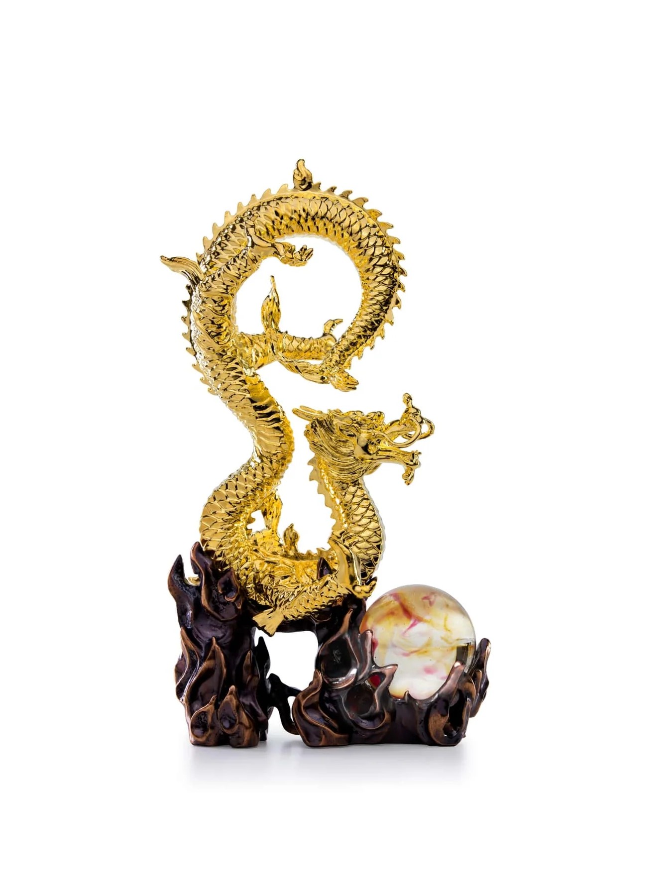 Tượng Hỏa Long Phụng Thụy LG2 tái hiện hình ảnh rồng thiêng uốn lượn từ ngọn lửa, nhả ra viên ngọc châu rực sáng - một biểu tượng quyền năng, trí tuệ và sự thịnh vượng trong văn hóa Á Đông. Rồng bay lượn theo hình số 8 - phát âm gần với chữ "Phát" trong Hán Việt – hàm ý phát tài phát lộc không ngừng. Ý nghĩa phong thủy: Rồng linh thiêng: Đại diện cho quyền lực, sức mạnh, trí tuệ và may mắn. Rồng là linh vật tối cao trong phong thủy, mang đến vận khí tốt lành, bảo vệ gia chủ và thu hút tài lộc. Ngọc châu thạch anh: Viên ngọc làm từ đá Thạch Anh tóc vàng (rutilated quartz) đặt bên rồng như một quả cầu trí tuệ, tượng trưng cho sự minh mẫn, quyết đoán và thành công. Hình số 8: Dáng rồng uốn lượn như con số 8 – biểu tượng của sự vô tận và phát đạt không ngừng. Chất liệu cao cấp: Rồng mạ vàng Thụy Sĩ 24K sắc sảo, tỏa ánh kim sang trọng. Đặt trên nền đồng đen chắc chắn, tăng chiều sâu và sự uy nghi cho tác phẩm. Viên ngọc Liu Li làm từ thạch anh rutilated ánh kim, tinh xảo và tràn đầy năng lượng tích cực. Kích thước: Tổng thể: 155mm (Dài) x 105mm (Rộng) x 320mm (Cao) Trọng lượng: 2.75kg Sự lựa chọn hoàn hảo: Bức tượng Hỏa Long Phụng Thụy LG2 không chỉ là một tác phẩm nghệ thuật đỉnh cao, mà còn là biểu tượng phong thủy quyền lực, lý tưởng để đặt trong văn phòng, phòng khách, phòng làm việc hoặc phòng họp lãnh đạo. Đây cũng là món quà tặng cao cấp cho doanh nhân, lãnh đạo, đối tác hoặc người đang trên hành trình chinh phục những mục tiêu lớn trong cuộc đời và sự nghiệp.