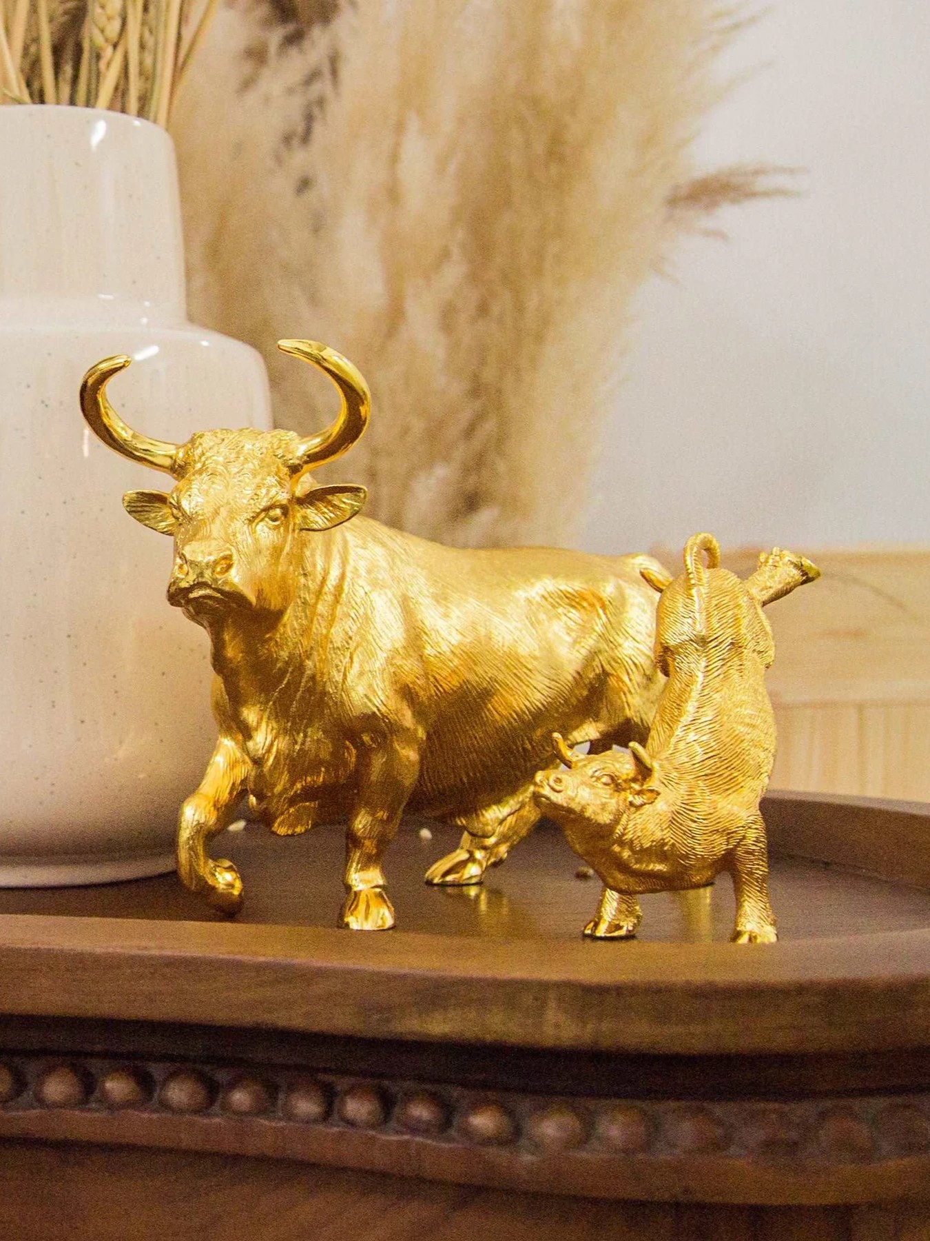Theo văn hóa Phương Đông, người ta tin rằng 12 Con giáp đều mang trong mình những điều may mắn, thịnh vượng và giàu có. Đây là lý do tại sao BST 12 Con Giáp của RISIS đều được chế tác tinh xảo thủ công và được mạ vàng Thụy Sĩ 24K tốt nhất – tạo nên những món quà đầy ý nghĩa và đáng trân trọng. Chúng cũng là sự bổ sung hoàn hảo cho không gian sống và làm việc của người sở hữu. Tuổi Sửu không sợ hãi đối mặt với những thử thách trong cuộc sống, sức mạnh và sự tự tin của nó được cảm nhận rõ ràng trong phong thái và tính cách của người mang tuổi này. Tượng Trâu cát lợi được mạ vàng 24K Kích thước: 218MM (L) X 100MM (W) X 157MM (H)